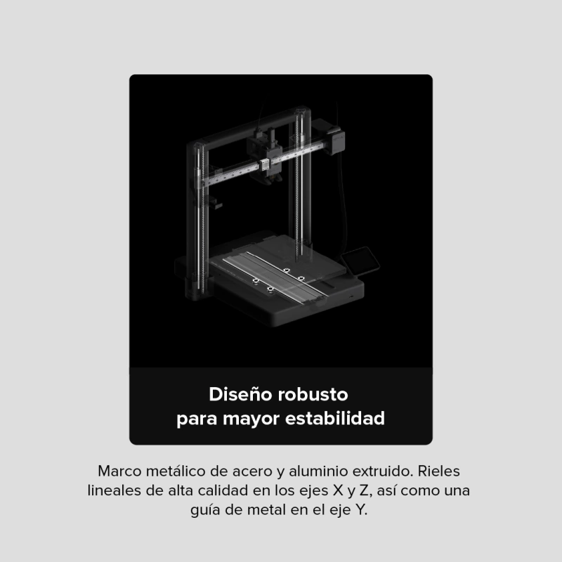 Diseño robusto para mayor estabilidad: Con un robusto marco metálico de acero y aluminio extruido, cojinetes estables y carriles lineales de alta calidad, el A1 demuestra lo que significan fiabilidad y durabilidad.